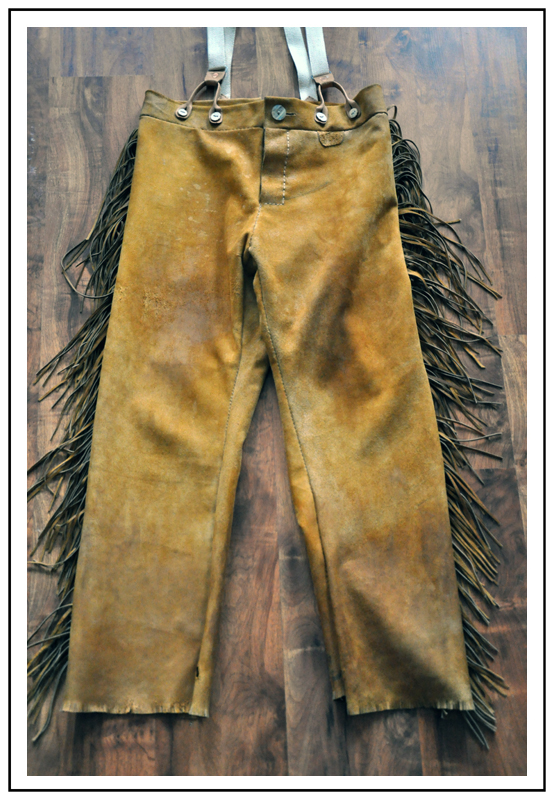 pants - leather, linen twine, artificial sinew, with buttons antler and mother of pearl