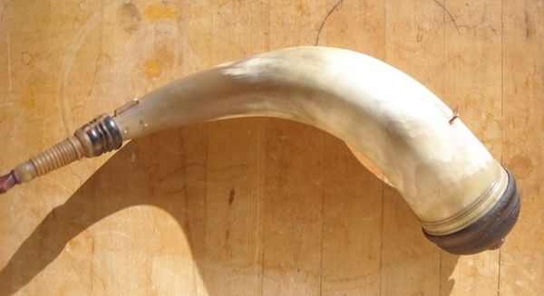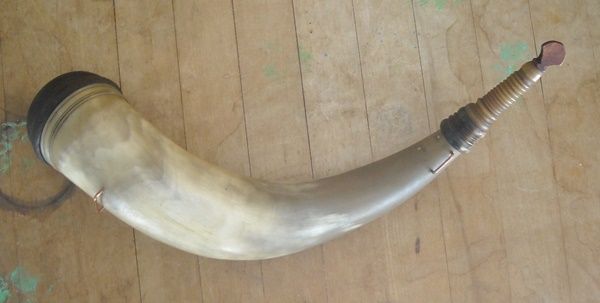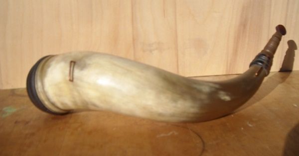 It originally made it in a class I got strong-armed into conducting at a rendezvous back in the late '80s. As originally made it held just over 2#. After a canoe wreck left it underwater for a week or so ~2005, the base plug cracked. I wound up shortening the horn at the base and fitting a new plug (you can see where the scrimshaw got "chopped" in a couple places).